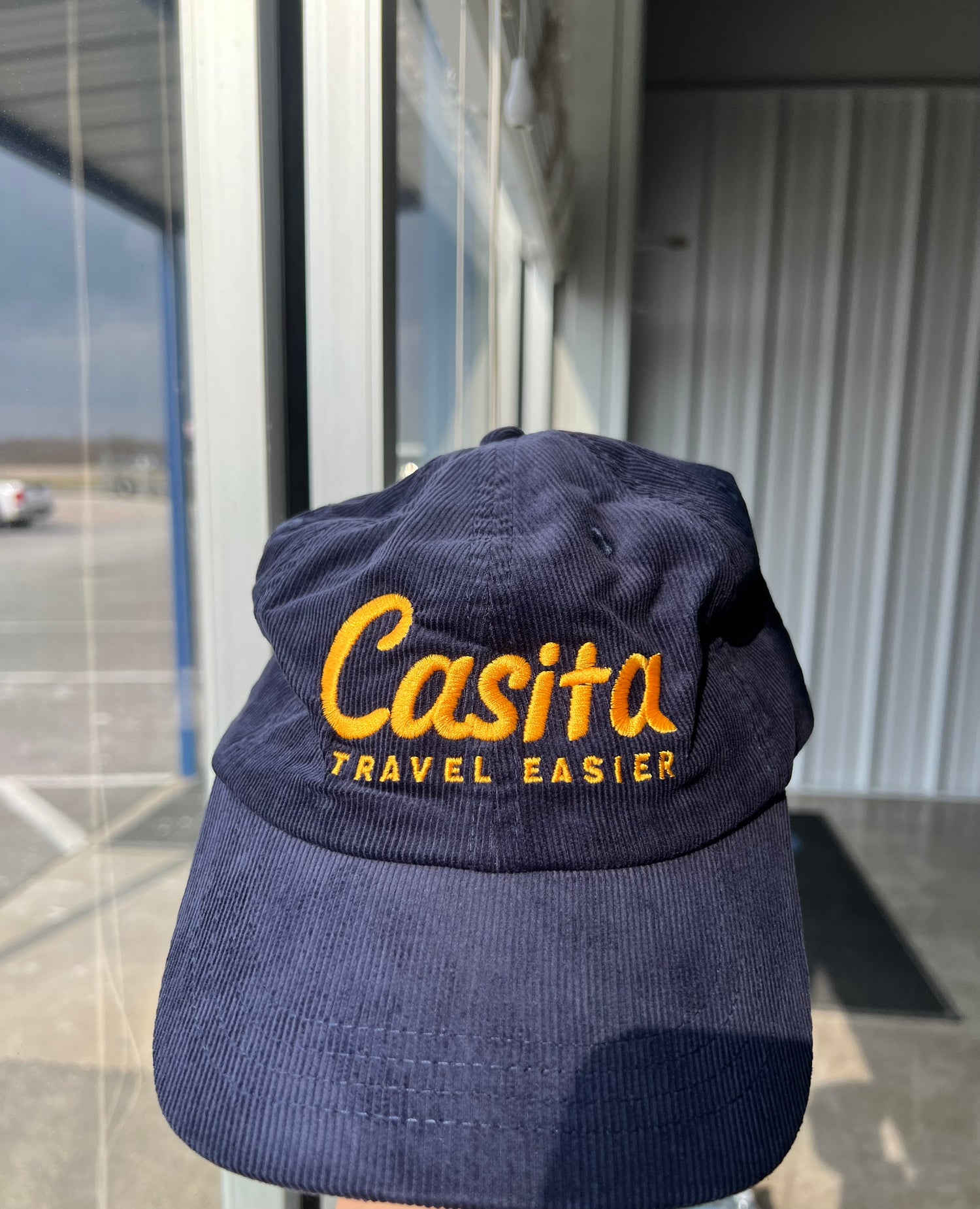 Casita Blue Corduroy Hat with yellow letters.
